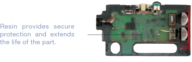 The resin evenly distributed inside the sensor securely protects electrical parts from vibration. In addition, it has passed vibration resistance tests of 100 hours or more. This allows for safe installation in areas with severe levels of vibration. The wide angle diffuse reflective type, which can detect over an area 10 times or more than that of the diffuse-reflective type, has simplified and enabled signal processing which had to be done at post-processing as well as types of detection that were not possible or were unstable until now. It can also detect transparent objects without use of a reflector. Polarizing filter is built in. Detection of mirror is possible. Spot size: ø2.5 mm at 30 mm distance. Optimal for small object detection.Vibration resistance far above that of JIS standards