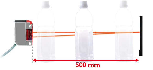 Stable detection of transparent objects such as film or glass bottles close to the sensor. There is also a refracted light eliminate function to enhance detection of plastic bottles.