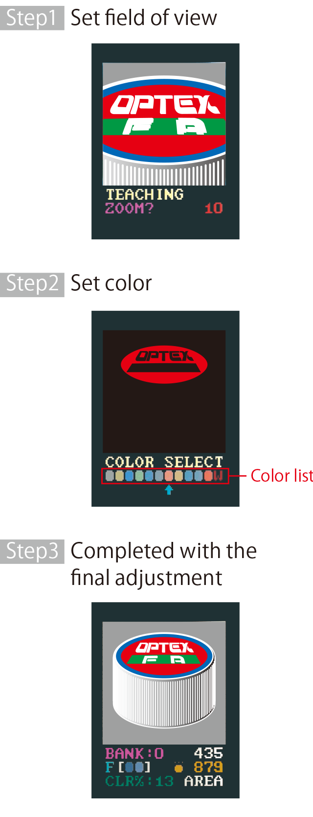 Teaching is easily done by three steps even in 30 seconds just like a color sensor. 16 Banks are available. You can Up to 15,000 colors are available to detect. It calculates color hue of each pixel so stable inspection is available. You can choose from 4 inspection range/field of view according to inspection target condition. Determine OK when the area that the color matches exceeds the threshold. Determine OK when the area that the color matches is in two thresholds.Three-Step-Teaching
